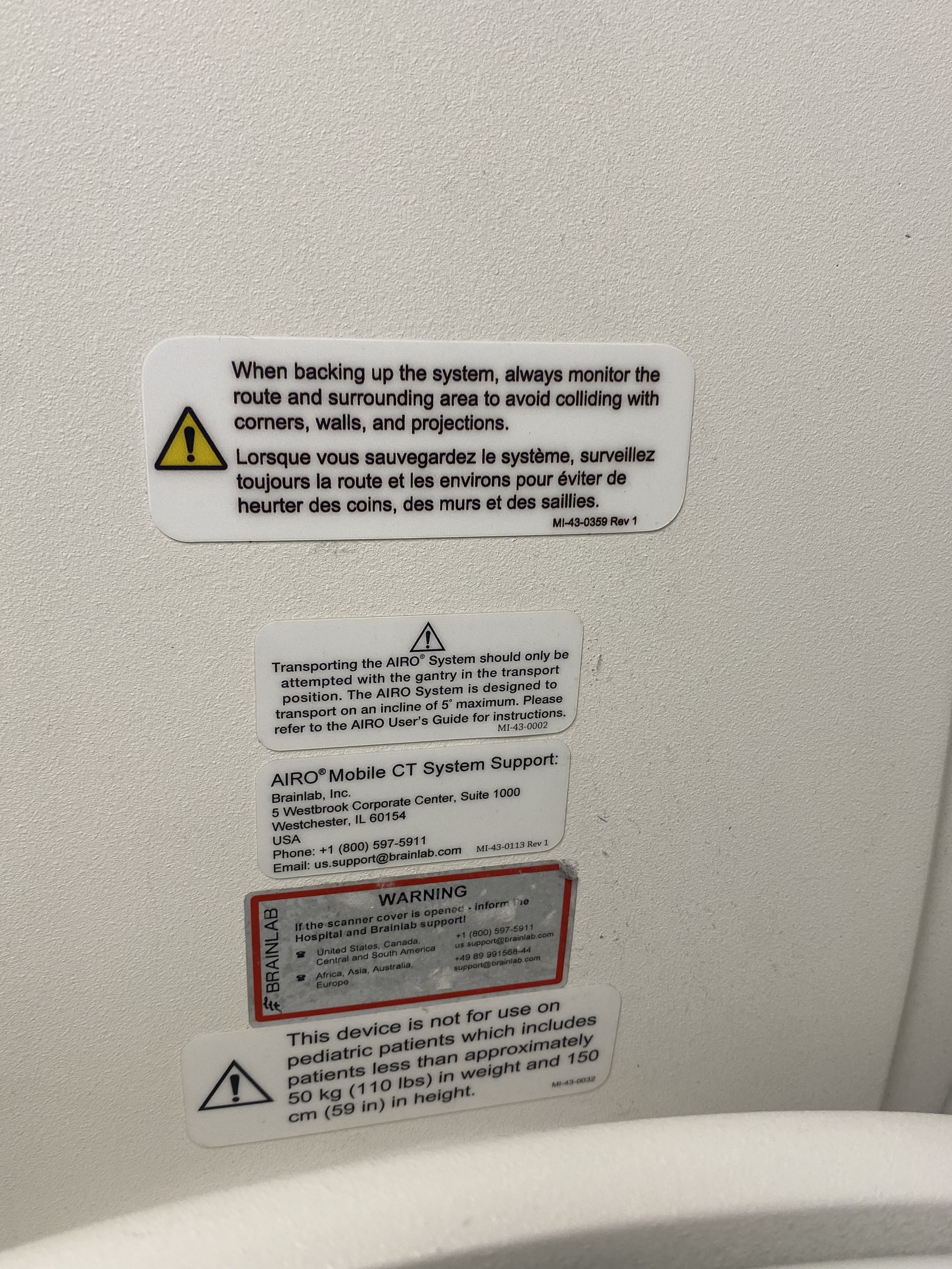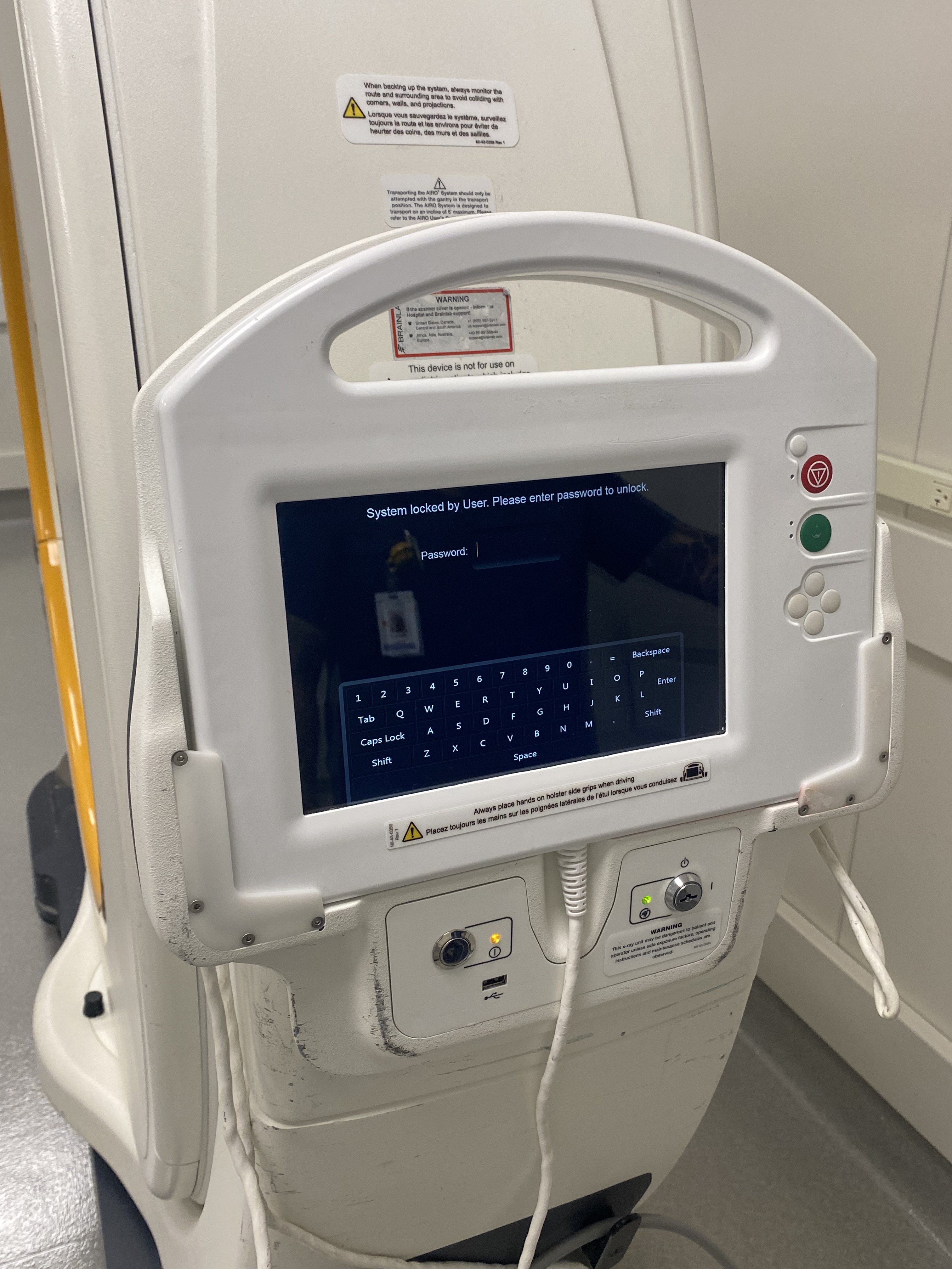 Im Transportmodus ist der Ring mit der Basis ausgerichtet, und das gesamte System wird über ein im Ring eingebautes Batteriepaket betrieben. In diesem Modus kann das Airo über das am Gimbal befestigte Pendant gesteuert und bewegt werden. Der Transport erfordert in der Regel nur eine Person, auch beim Fahren über Rampen. Eine zweite Person kann als Einweiser in stark frequentierten Bereichen helfen. Sobald das Airo am gewünschten Ort (zum Lagern oder Scannen) angekommen ist, wird es an eine Standard-Steckdose zum Aufladen angeschlossen.